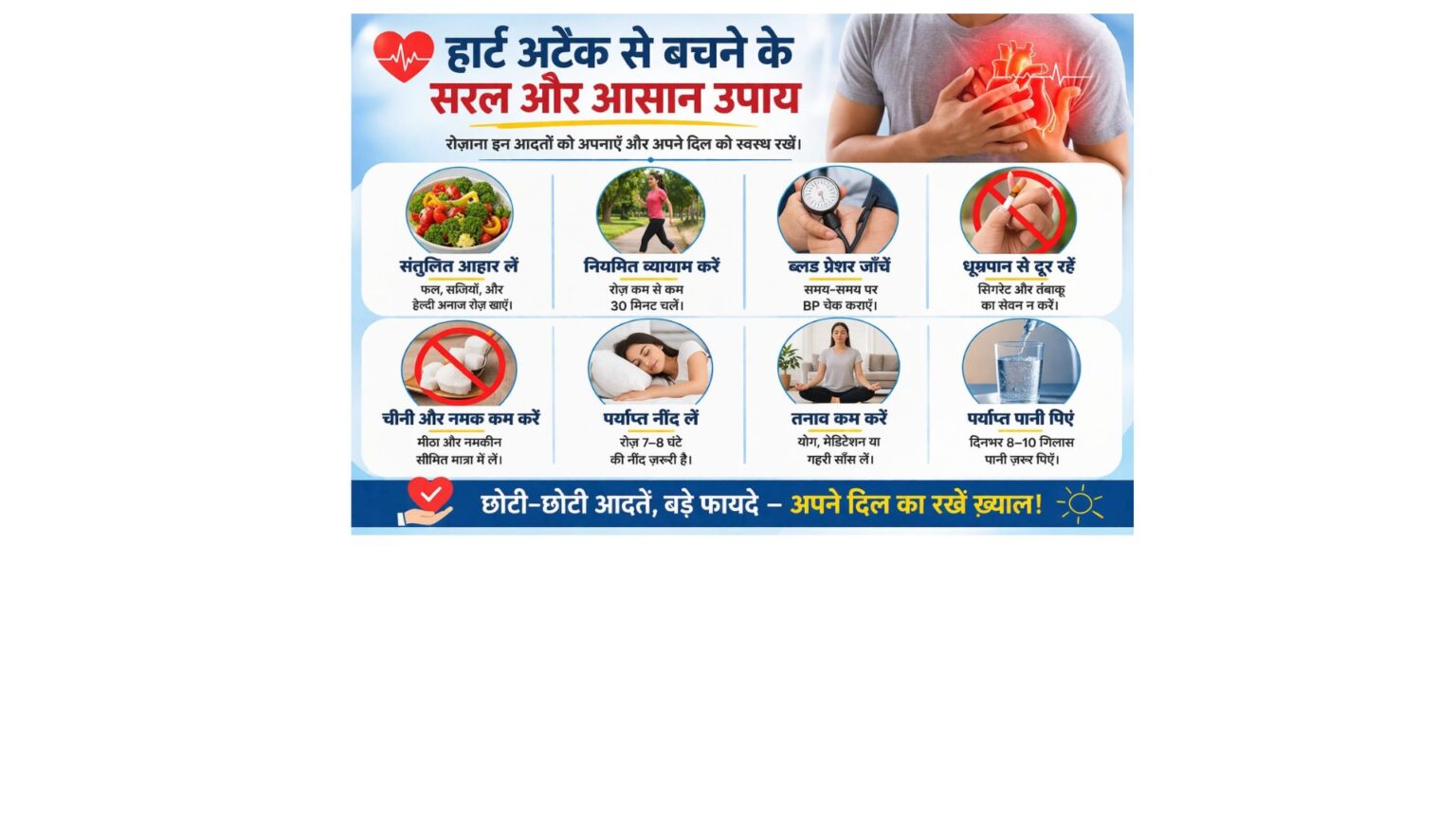 अंत में, यह समझना जरूरी है कि हार्ट अटैक से बचाव के लिए महंगे इलाज की नहीं, बल्कि सही जीवनशैली की जरूरत होती है। यदि हम अपनी दैनिक आदतों में छोटे-छोटे बदलाव करें, तो हम अपने दिल को लंबे समय तक स्वस्थ रख सकते हैं।