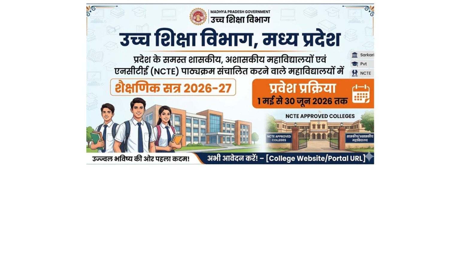 उच्च शिक्षा विभाग अंतर्गत प्रदेश के समस्त शासकीय, अशासकीय महाविद्यालयों एवं एनसीटीई पाठ्यक्रम संचालित करने वाले महाविद्यालयों में शैक्षणिक सत्र 2026-27 के लिए प्रवेश प्रक्रिया 1 मई से 30 जून 2026 तक संचालित की जाएगी।